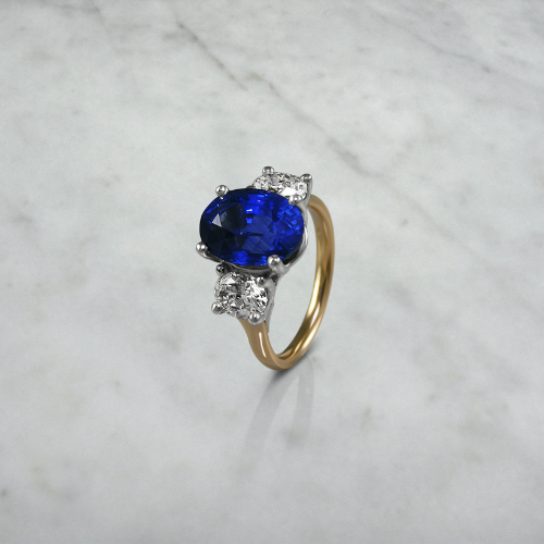 An oval cut sapphire and diamond engagement ring