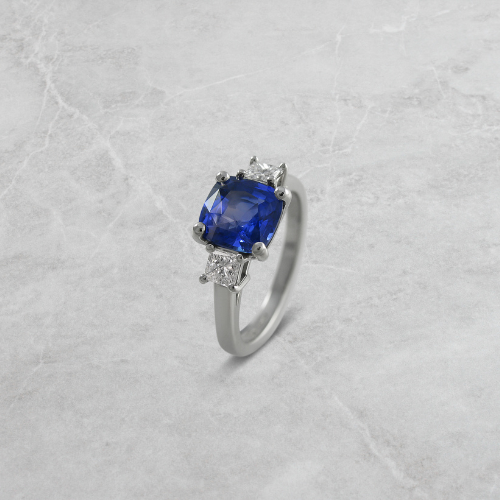 A cushion cut sapphire and diamond engagement ring