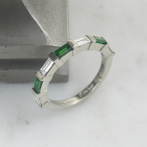 A baguette cut engagement ring featuring alternating tsavorite garnets and diamonds