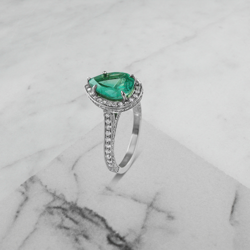 A pear-shaped emerald engagement ring